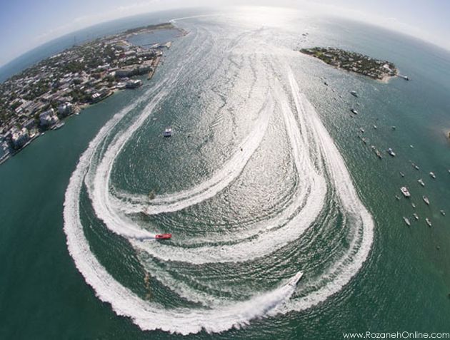 این عکس هم نشاندهنده اثری از فعالیتهای انسانی روی این کره آبی و خاکی است. هرچند این اثر خیلی گذراست. موج و کفِ حرکتِ دیوانهوار این قایقهای تندرو بعد از دقایقی از بین رفته است. این عکس استعارهای از تاثیرات زودگذر انسانی است.
